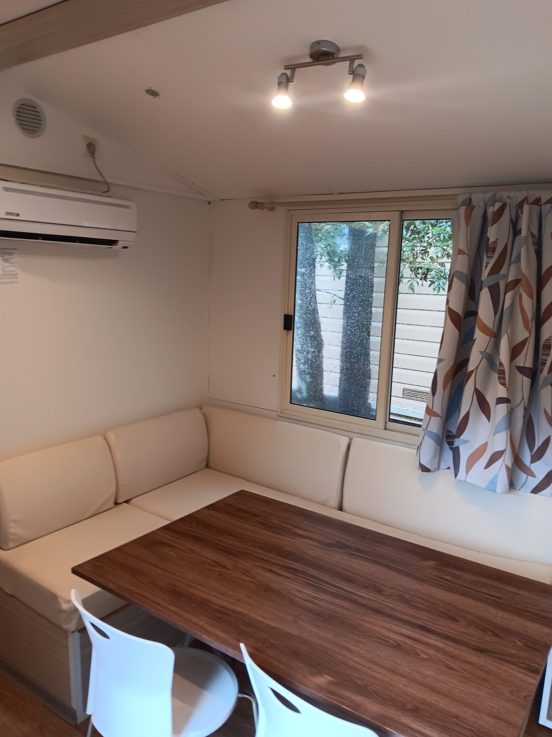 La composizione nello specifico prevede, N° 1 Soggiorno grande con  un divano ad angolo, tavolo da pranzo, Cucina con piano cottura 4 fuochi, frigorifero, aria condizionata/pompa di calore, cucina completa di mobili, N° 1 Camera da letto matrimoniale completa di mobili, N° 1 Camera con due posti letto singoli completa di mobili, N° 1 Bagno con doccia grande e lavabo e N° 1 Bagno con water